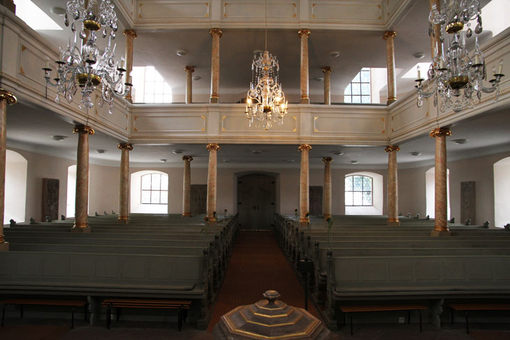 Innen jedoch ergibt sich ein völlig anderer, saalartiger Raumeindruck. Der Raum ist überraschend hell und besitzt eine dezente Farbigkeit mit markanten Akzenten durch die Säulen. Der Raum wirkt feierlich und dezent prunkvoll. Hier offenbart sich, daß der Umriß der Kirche sich vom Turm ausgehend in zwei Stufen verbreitert. Was den Innenraum so besonders macht, ist die typisch protestantische Raumstrukturierung mit den in zwei Ebenen übereinander auf drei Seiten umlaufenden, tiefen Emporen auf in die Sitzreihen reichenden Säulen. Insgesamt 28 dieser hölzernen und mit Stuckmarmor überzogenen Säulen mit vergoldeten ionischen Kapitellen und Basisringen stützen die Emporen. So konnten insgesamt in der Kirche 1100 Sitzplätze geschaffen werden. Rechts und links im Turm führen Treppen hoch auf die Emporen und noch weiter hinauf bis zur Turmuhr, die allerdings von 1899 stammt, weil das Original von 1785 kaputtgegangen war. Noch höher liegt die Glockenstube mit fünf Glocken.