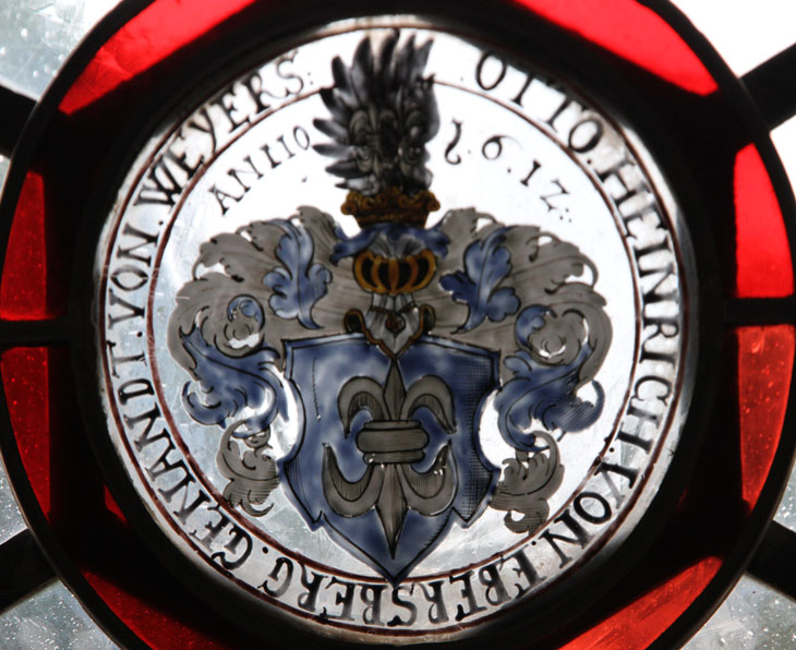 2.) Ein auf 1612 datiertes Glasfenster trägt das Wappen von Otto Heinrich von Ebersberg gen. Weyhers (8.3.1553-21.4.1621), dem letzten männlichen Mitglied der Balthasarischen Nebenlinie zu Gersfeld. Wir sehen in Blau eine silberne Lilie, auf dem gekrönten Helm mit blau-silbernen Decken ein blauer, beiderseits mit einer silbernen Lilie belegter Flug. Der Flug der Helmzier wird etwas unglücklich geschlossen dargestellt, was nicht zur Frontalansicht des Helmes paßt. Sein Wappen ist auch am Oberen Schloß Gersfeld angebracht.