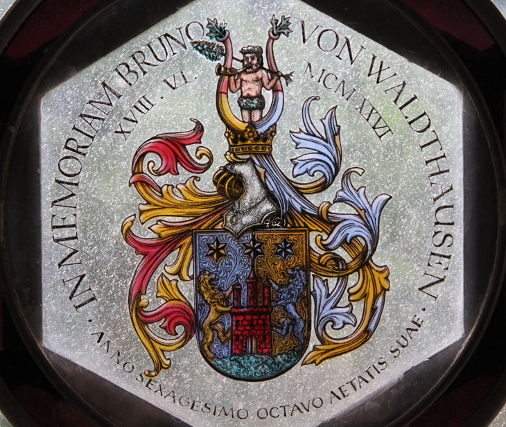 3.) Ein weiteres Glasfenster trägt das Wappen von Dr. iur. Bruno von Waldthausen (11.4.1862-18.6.1926), Sohn von Kommerzienrat Gustav Ernst Walthausen (20.5.1811-22.1.1883) und dessen zweiter Ehefrau, Helena (Lenchen) Sophia Christina Walthausen (21.2.1825-15.4.1902). Er hatte 1903 die Herrschaft Gersfeld käuflich erworben. Sein Wappen, das auch am Unteren Schloß angebracht ist, dort allerdings ohne Farben und ohne Oberwappen, zeigt in blau-golden gespaltenem Schild über einem grünen Boden eine rote, dreitürmige Burg mit Tor, von zwei einwärts aufspringenden Löwen gehalten, der rechte golden, der linke blau, oben begleitet von drei balkenweise gestellten, sechszackigen Sternen in verwechselten Farben, auf dem gekrönten Helm mit rechts rot-goldenen und links blau-goldenen Decken ein wachsender wilder Mann, um Hüfte und Stirn mit grünem Laub bekränzt, mit der Rechten ein Horn zum Blasen an den Mund setzend, mit der Linken eine ausgerissene, naturfarbene Tanne schulternd, zwischen einem rechts rot-golden, links rot-blau geteilten Paar Büffelhörner, in den Mündungen mit grünen Tannenreisern besteckt. Die Familie hat auch heute noch das Kirchenpatronat inne.