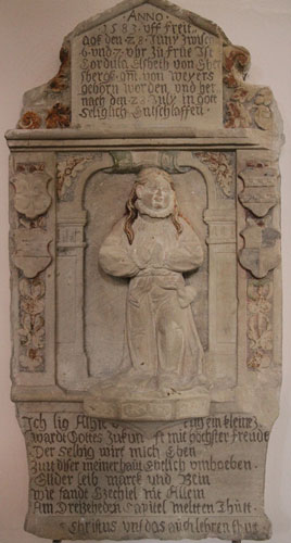 4.) Ein Kinderepitaph für Cordula Elsbeth von Ebersberg gen. Weyhers (28.6.1583-28.7.1583), Tochter von Otto Heinrich von Ebersberg gen. Weyhers (8.3.1553-21.4.1621) zu Gersfeld und dessen erster Ehefrau, Magdalena Truchseß von Wetzhausen. Das Kind steht mit Halskrause und offenem Haar aufrecht auf einem polygonal vorspringenden Sockel im Zentralfeld und ist von einer Bogenarchitektur umgeben. Die Großeltern väterlicherseits waren Christoph (Christopher) von Ebersberg gen. Weyhers (-1562) zu Gersfeld und Kunigunde von Schrimpf (von Berg gen. Schrimpf) zu Schwarzenau. Die Großeltern mütterlicherseits waren Wolff Truchseß von Wetzhausen zu Sternberg und Schweickershausen und Margaretha Schott von Schottenstein aus dem Hause Eichelsdorff. Vier Wappenschilde sind an den beiden seitlichen Randvorlagen aufgelegt, auf jeder Seite zwei im oberen Teil. Entsprechend der Ahnenprobe sehen wir heraldisch oben rechts das Wappen der von Ebersberg gen. Weyhers (in Blau eine silberne Lilie), rechts unten das der von Schrimpf (in Blau ein in zwei Reihen silbern-rot geschachter Balken), links oben das der Truchseß von Wetzhausen (in Gold zwei in zwei Reihen rot-silbern geschachte Balken) und links unten das der Schott von Schottenstein (silbern-rot geviert). Die Inschrift im Aufsatz lautet: "ANNO / 1583 uff freit/agk den 28 Juny zwisch/(en) 6 und 7 uhr zu frue(h) Ist / Cordula Els(isa)beth von Eber/sbergk g(e)n(ann)t von Weyers / gebor(e)n worden und her/nach den 28 July in gott / seliglich entschlaffen." Die Sockelzone trägt den Text: "Ich li(e)g Alhier selig ein kleines / (er)wardt(e) Gottes Zukunft mit höchster Freude / Der selbig wirt mich Eben / zuu di(e)ser meiner haut Ehrlich umbgeben / Gli(e)der leib marck und Bein / wie san(k)dt Ezechiel ni(ch)t Allein / Am Dreizehe(n)den Capitel meltten Thutt / Christus uns das auch lehren thut".