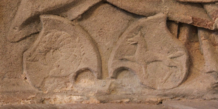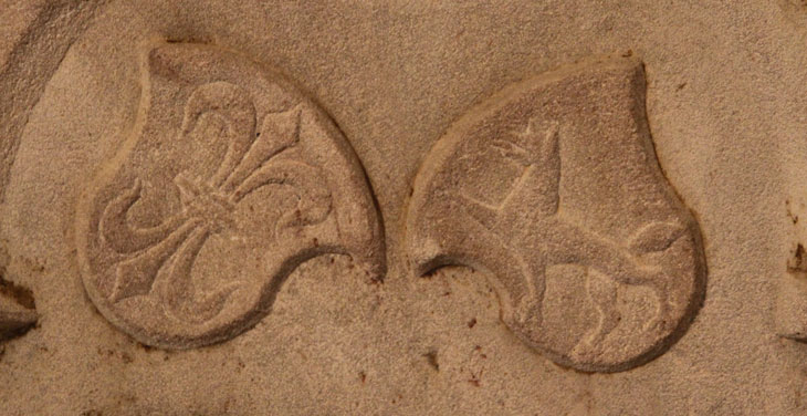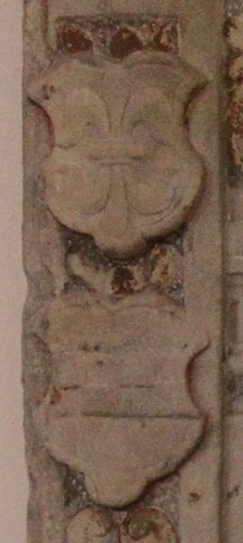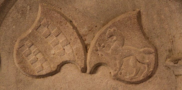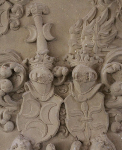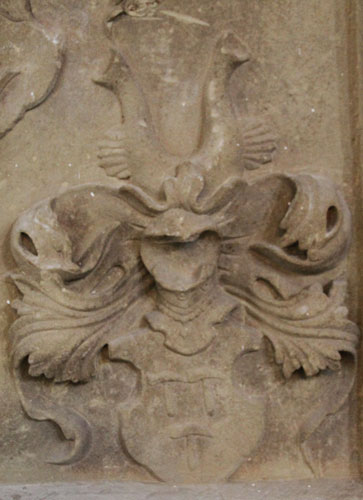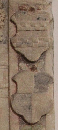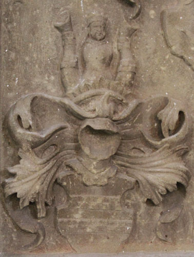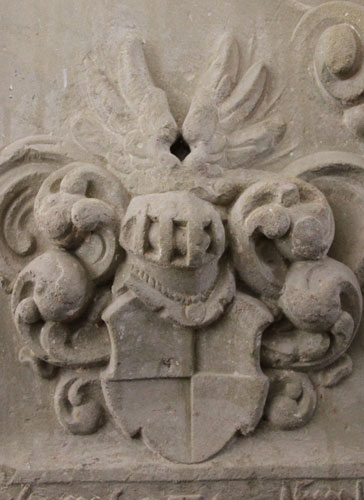 Abb.: Wappenpaar, Seite des Ehemannes, oben. Links vermutlich von Ebersberg, rechts vielleicht von Fuchs.