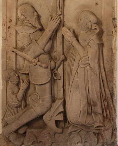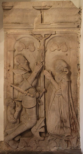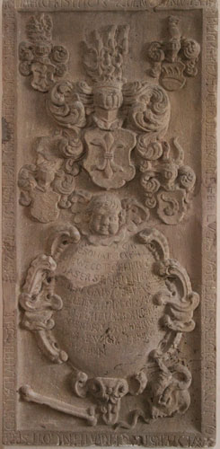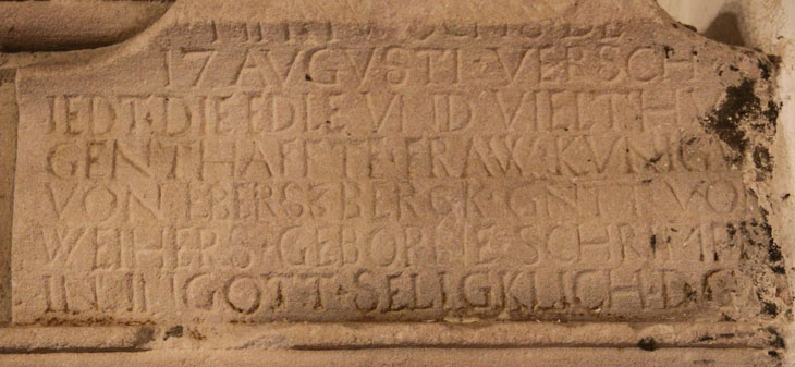 5.) Die Grabplatte für Ritterrat Lucas von Ebersberg gen. Weyhers (18.12.1581-3.1.1657) ist mit folgender Inschrift versehen: "IM IAHR CHRISTI 1657 DEN 3. IANV(AR) IST DER REICHSFREY HOCHEDEL GEBOHRNE HERR LVCAS VON EBERSBERGK GENANDT VON WEYHERS RITTERRATH (I)N GOTT SEELIG ENTSCHLAFFEN (SEINES ALTE)RS 74 IAHR(E) 15 TAG(E) DES(S)EN SEEL(E) GOTT GN(A)EDIG SEIE AMMEN". Im unteren Bereich des Zentralfeldes ist eine weitere Inschrift religiösen Inhalts angebracht. Vanitas-Symbole wie ein Röhrenknochen und ein Totenschädel, aus dem Würmer kriechen, illustrieren ganz unten die Vergänglichkeit des menschlichen Körpers. Im oberen Bereich befinden sich fünf Vollwappen, eines in der Mitte und vier außen herum. Das zentrale, größer dargestellte Wappen ist dasjenige der von Ebersberg gen. Weyhers, in Blau eine silberne Lilie, auf dem gekrönten Helm mit blau-silbernen Decken ein blauer, beiderseits mit einer silbernen Lilie belegter Flug. Das Wappen wiederholt sich in der rechten oberen Ecke. Links oben sehen wir das Wappen der von Rüdigheim, golden-rot dreimal im Bogen geteilt, die oberste Teilung besetzt mit drei gestielten Rosen (?), auf dem Helm ein wachsender Rüdenrumpf mit Halsband (mehrere Varianten im Aschaffenburger Wappenbuch). Rechts unten das Wappen ist zerstört; zu erwarten wäre dasjenige der von Buchenau, in Gold ein golden gekrönter grüner Sittich mit rotem Halsband, auf dem Helm mit grün-goldenen Decken ein wachsender, auffliegender golden gekrönter grüner Sittich mit rotem Halsband und goldenen Flügeln (so nach dem Aschaffenburger Wappenbuch). Der Sittich ist auf dem Helm zu erkennen. Das vierte und letzte Ahnenwappen links unten gehört zur Familie von Fechenbach, in Silber ein schwarzes Steinbockshorn, auf dem Helm mit schwarz-silbernen Decken ein silbern-schwarz übereck geteiltes Paar Büffelhörner (nach dem Aschaffenburger Wappenbuch). Diese vier Wappen werden durch folgende genealogischen Zusammenhänge erklärt: Lucas von Ebersberg war der Sohn von Hammann (Hermann) Bernhard von Ebersberg gen. Weyhers (-1587) zu Haselbach, und Dorothea von Rüdigheim. Seine Großeltern väterlicherseits waren Lucas von Ebersberg gen. Weyhers zu Haselbach und Barbara von Buchenau; seine Großeltern mütterlicherseits waren Hammann von Rüdigheim und Regina von Fechenbach (alle Genealogien nach Biedermann).