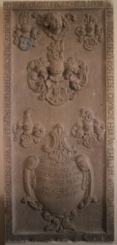 7.) Die Grabplatte für Wilhelm Rudolph von Ebersberg gen. Weyhers (15.9.1619-1.2.1672), Ehemann der Vorigen, besitzt folgende Inschrift: "IM IAHR C(H)RISTU 1672 DEN 1 FEBR(UARII) IS(T) DER REICHS FREY HOCH EEDEL GEBORGNE HERR WILHELMM RVDOLPH VON EBERSBERGK (GENANNT) VON WEYHERS IN GOTT ENTSEHLAFEN SE(I)NES ALTERS 52 IA(H)R(E) 4 MA(O)NET(E) 16 TAG(E) DES(S)EN SEELE GOTT GN(A)EDIG SEIN WOLLE". Im unteren Bereich des Zentralfeldes befindet sich noch eine zweite Inschrift religiösen Inhalts. Oben in der Mitte des Zentralfeldes befindet sich ein geflügelter Engelskopf. Im Zentrum der Platte ist das Wappen der von Ebersberg gen. Weyhers wie beschrieben zu sehen. In der rechten oberen Ecke wiederholt es sich. Gegenüber oben links befindet sich das Wappen der von Berlichingen, in Schwarz ein silbernes fünfspeichiges Rad, auf dem gekrönten Helm mit schwarz-silbernen Decken ein sitzender Wolf von natürlicher Farbe, der ein silbernes Lamm in seinem Maul hält. Links unten sehen wir das Wappen der von Rüdigheim, golden-rot dreimal im Bogen geteilt, die oberste Teilung fünfmal im Bogen nach oben ausgezogen und besetzt mit drei gestielten Rosen (?), auf dem Helm ein wachsender Rüdenrumpf mit Halsband (mehrere Varianten im Aschaffenburger Wappenbuch). Rechts unten wiederholt sich das Wappen der von Berlichingen. Diese vier Wappen werden durch folgende genealogischen Zusammenhänge erklärt: Der Verstorbene hatte als Eltern Ritterrat Lucas von Ebersberg gen. Weyhers (18.12.1581-3.1.1657), für den hier auch eine Platte existiert, und dessen erste Ehefrau Elisabeth Ursula von Berlichingen (-11.10.1639) aus dem Hause Vilseck. Seine Großeltern waren väterlicherseits Hammann (Hermann) Bernhard von Ebersberg gen. Weyhers (-1587) zu Haselbach und Dorothea von Rüdigheim. Mütterlicherseits werden bei Biedermann und in anderen Quellen als Großeltern Burkhard von Berlichingen und Apollonia von Thalheim angegeben, was aber nicht zu dem zweimaligen Auftreten des Wappens Berlichingen paßt. Die Ehe mit der Frau von Thalheim ist durch andere Grabplatten, z. B. in Jagsthausen, verifiziert. Vielleicht ist das auf der Gersfelder Platte eine Verwechslung mit dem Bruder der Mutter, der tatsächlich auch eine von Berlichingen aus einer anderen Linie geheiratet hatte.