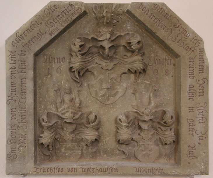 8.) Ein fünfeckiger Gedenkstein von Otto Heinrich von Ebersberg gen. Weyhers aus dem Jahre 1608, vielleicht ein Fragment eines größeren Konstrukts. Die Inschrift lautet: "Ein Hertz von Reuw und leidt gekrenckt, / Mit Christi Teurem blut besprengt, Otto Heinerich vom Ebersberg / gnant von weyhers / Bring ich meinem Herrn Jhesu zu / schlaff drumb alhie in guter Ruh", im Zentralfeld "Anno Christi 1608". Wir sehen drei (1:2) Vollwappen, oben mittig das für Otto Heinrich von Ebersberg gen. Weyhers (8.3.1553-21.4.1621) zu Gersfeld, den letzten der Balthasarischen Nebenlinie zu Gersfeld, mit dem Wappen der Familie wie beschrieben. Unten sehen wir einerseits das Wappen für seine erste Ehefrau, Magdalena Truchseß von Wetzhausen, in Gold zwei in zwei Reihen rot-silbern geschachte Balken, auf dem ungekrönten Helm mit rot-goldenen oder auch rot-silbernen Decken zwei goldene, mit je zwei in zwei Reihen rot-silbern geschachten Balken belegte Büffelhörner, dazwischen ein wachsender menschlicher Rumpf (meist eine Jungfrau, hier ungewiß) in roter Gewandung mit goldenen Zöpfen und ebensolcher Krone (hier eher eine Mütze). Auf der anderen Seite sehen wir das Wappen für seine zweite Ehefrau, Helena vom Stein zum Altenstein, in Rot drei (2:1) silberne Streithämmer, auf dem Helm mit rot-silbernen Decken ein Paar roter Büffelhörner mit silbernem Kamm. Das Ehewappen dieser zweiten Ehe ist auch am Oberen Schloß als auf 1605 datierte Tafel angebracht, wo auch fast der gleiche Spruch verwendet wird. Das Fragment ist auf 1608 datiert, als Todesjahr wird für Otto Heinrich jedoch allgemein 1621 angegeben, vermutlich ist der Stein daher nicht für ihn selber (zumal die oben beschriebene Glasscheibe auf 1612 datiert ist, also muß er zumindest bis dahin gelebt haben), sondern Teil eines Epitaphs für ein verstorbenes Kind; der Kontext der Entstehung und der ursprünglichen Anbringung ist unklar.