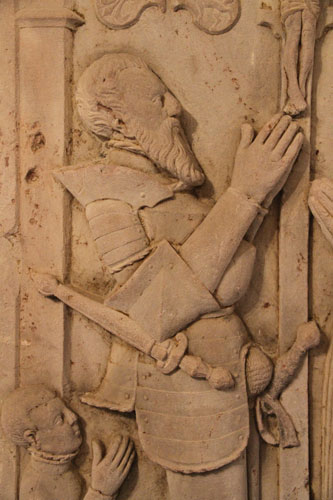Nicht aber paßt dazu der Unterbau mit dem Hauptfeld, in dem Ehemann und Ehefrau rechts und links von einem Kruzifix dargestellt werden und hinter dem Ehemann noch ein Kind steht. Der Mann ist bärtig und barhäuptig, ansonsten vollständig gerüstet mit Dolch an der rechten und Schwert an der linken Seite, eigentümlich schräg kniend, um Raumtiefe darzustellen. Den Helm hat er an den Fuß des Kreuzes abgelegt. Genau wie er legt die Ehefrau beide Hände zum Gebet zusammen. Beide Figuren werden von einer Scheinarchitektur mit zwei Bögen eingerahmt. Jede der Hauptfiguren besitzt vier Wappen einer Ahnenprobe, je zwei oben in der Fläche des Bogenfeldes und je zwei weitere unten am Sockel. Im Detail ist die Ahnenprobe (möglicherweise rechts: Ebersberg/Schneeberg, Fuchs, Cleen/Dernbach/Nordeck zur Rabenau, Redwitz/Marschalk von Ebnet; links: Truchseß von Wetzhausen, Bibra, von der Tann, Fuchs) ungeklärt und paßt bis jetzt nicht zu dem bei Biedermann zu findenden Familiengefüge, Hinweise willkommen. Ganz sicher paßt die Wappenkombination aber nicht zu den in den obigen Inschriften genannten Personen, weil weder ein Schrimpf-Wappen für die Ehefrau noch ein solches der Voit von Salzburg für Christophs Mutter oder ein Steinau-Wappen für Kunigundes Mutter existiert, und weil Christoph weit und breit keine Verbindung zu den Truchseß von Wetzhausen hat, das hatte erst sein Sohn, und auch dort passen die Wappen nicht zu den Ahnen, denn dann müßten Schrimpf und Schott von Schottenstein auftauchen. Also muß die genaue Zuordnung der Personen vorerst offen bleiben; sicher ist nur, daß es nicht zu Biedermanns Genealogie paßt.