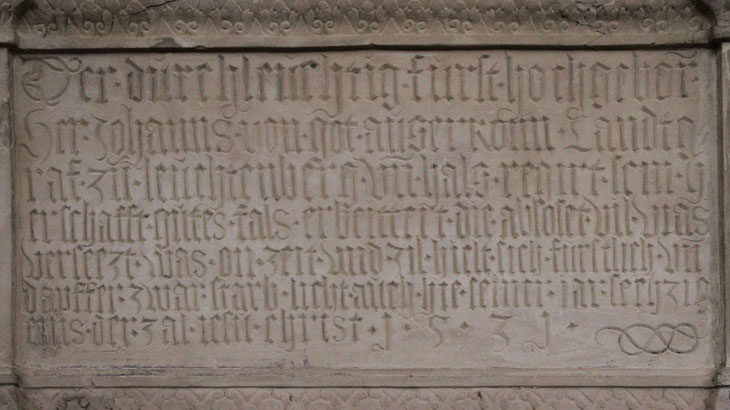 Die von zwei ornamentierten seitlichen Flächen eingefaßte Inschrift im Sockelbereich hat den Wortlaut: "Der durchleuchtig fu(e)rst hochgebor(ene) / Her(r) Johann(e)s von got(t) auserkonn (= auserkoren) Landtg/raf zu leuchtenberg un(d) hals regi(e)rt sein H/er(r)schafft gutes fals erveittert die ablo(e)set vi(e)l was / verseszt was o(h)n(e) zeit und zi(e)l hielt sich fu(e)rstlich un(d) / dapffer (= tapfer) zwar starb licht (= liegt) auch hie(r) seiner ia(h)r sechzig / eins der za(h)l iesu christ 1531". Diese Zeilen sind ein kurzgefaßtes Herrscherprogramm, in dem u. a. die fiskalische Disziplin bei der Rückeinlösung von Pfandschaften ("ablo(e)set vi(e)l was / verseszt") genannt wird.
