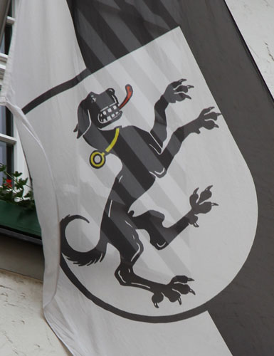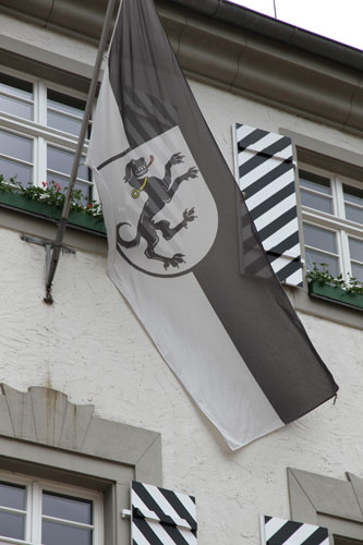 Am Rathaus weht die Stadtflagge von Tettnang, mit zwei Streifen in den Stadtfarben Schwarz und Weiß, belegt mit dem Stadtwappen, welches in Silber eine aufspringende schwarze Bracke mit roter Zunge und goldenem, beringtem Halsband zeigt.