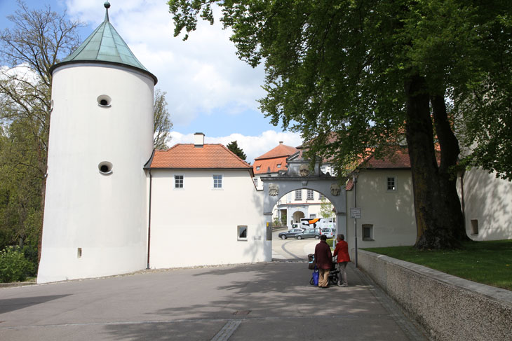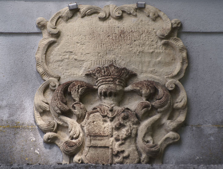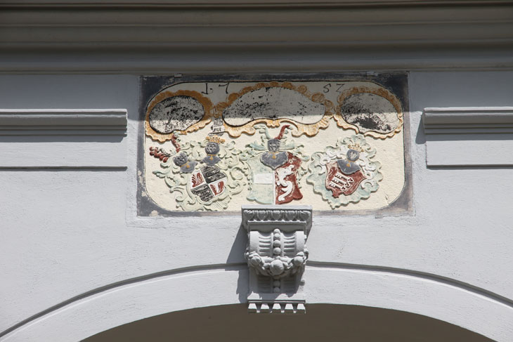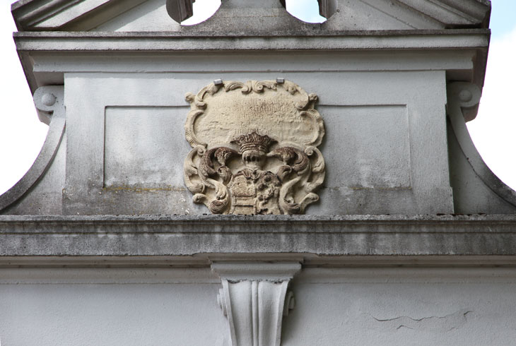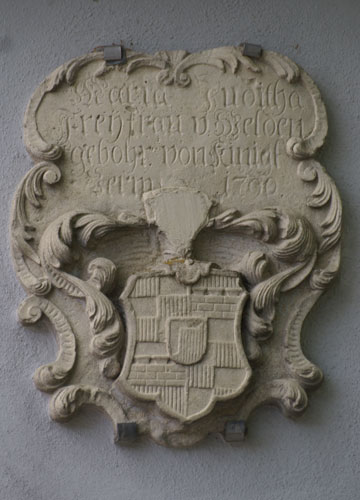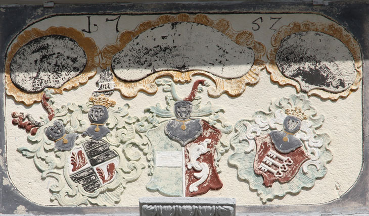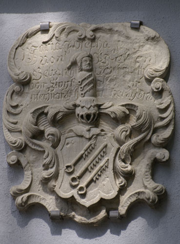 Einen zweiten Wappenstein, ebenfalls mit drei Komponenten, sehen wir am um 1660 erbauten Erweiterungsbau ganz links über der Toreinfahrt. Er ist auf 1752 datiert und somit Zeugnis eines spätbarocken Umbaus. Die Inschriften sind durch die Verfärbungen so gut wie unleserlich. Das mittlere Wappen ist das der von Welden wie zuvor beschrieben. Das heraldisch rechte Wappen ist das der von Starzhausen, geviert, Feld 1 und 4: in Silber ein gebogener roter Greifenfuß, Feld 2 und 3: in Schwarz ein silberner Balken mit dem Wort "lieb" in schwarzen gotischen Kleinbuchstaben. Dazu werden zwei Helme geführt, Helm 1 (rechts): auf dem ungekrönten Helm mit rot-silbernen Decken ein Paar Büffelhörner, das rechte silbern, das linke rot, außen jeweils mit Straußenfedern in Gegenfarbe besteckt, Helm 2 (links): auf dem gekrönten Helm ein schwarzer Flug (hier nur ein Flügel sichtbar) mit einem silbernen Balken, darauf das Wort "lieb" (Siebmacher Band: BayA1 Seite: 182 Tafel: 186, Band: OÖ Seite: 396 Tafel: 101, Berliner Wappenbuch, Wappenbuch des churbayrischen Adels BSB Cgm 1508, Siebmacher Band: BayA3 Seite: 91 Tafel: 58, Wernigeroder Wappenbuch). Der Stammsitz der Familie ist Starzhausen bei Pfaffenhofen, wo ein 1709 erbautes kleines Schloß vor sich hin verfällt. Ab 1599 ist das Stammwappen mit dem Greifenbein geviert mit dem Wappen Zachreis von der Lieb; Johann Christoph Starzhauser, Domherr in Regensburg und Passau, und seine Brüder Johann Heinrich, Christoph Bernhard, Johann Wilhelm und Johann Jakob erhielten am 23.9.1599 vom Kaiser zu Pilsen per Diplom diese Wappenvermehrung. Am 7.5.1678 erhielten Johann Carl von Starzhausen und dessen Cousins Albert Christoph und Georg Heinrich in zwei kaiserlichen Diplomen zu Laxenburg eine Bestätigung ihres alten Herrenstandes. Die Familie ist erloschen. Heraldisch links sehen wir erneut das Wappen der Speth von Zwiefalten wie oben beschrieben, mit einer ungewöhnlichen Darstellung der Schlüssel und nur mit Helmkrone, ohne Kleinod, und die intakten Ornamente zeigen, daß hier auch nie eine im Relief angelegt war.