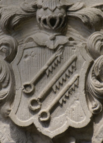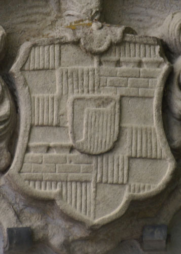 Diese Wappenkombination steht für Carl Albert Freiherr von Welden zu Groß-Laupheim und Hochaltingen (19.1.1741-26.10.1808), kgl.-bayerischer geheimer Rat, der in erster Ehe Maria Josepha Freiin Speth von Zwiefalten (28.2.1750-) geheiratet hatte und in zweiter Ehe Juditha Maria Anna Walburga Francisca de Paula Gräfin Künigl Freiin zu Ehrenburg und von Warth (13.8.1769-7.4.1857). Auf dem Stein mit dem Wappen der zweiten Ehefrau ist das Jahr der Vermählung angegeben, 1790. Der Ehemann war der Sohn von Constantin Adolph Freiherr von Welden zu Hochaltingen (1715-1772) und Maria Maximiliana Freiin zu Starzhausen (1717-1752). Die erste Ehefrau war die Tochter von Franz Joseph Tiber (Tiberius) Freiherr Speth von Zwiefalten zu Untermarchthal (27.7.1713-24.8.1771) und Friederica Maria Concordia Freiin Speth von Zwiefalten (1720-). Die zweite Ehefrau war die Tochter von Leopold Franz Joseph Johann Baptist Johann Nepomuk Graf Künigl Freiherr zu Ehrenburg und von Warth (20.12.1726-1.5.1813) und Gabriele Maria Gräfin Künigl Freiin zu Ehrenburg und von Warth (29.5.1738-6.1.1775), ein klassischer Fall von Ahnenschwund durch Cousinenheirat.