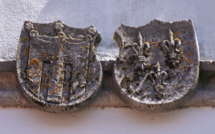 einem Satteldach abgeschlossen, und auf der Giebelseite mit fialengekrönter vertikaler Gliederung (Abb. oben rechts) sind vier Wappenschilde