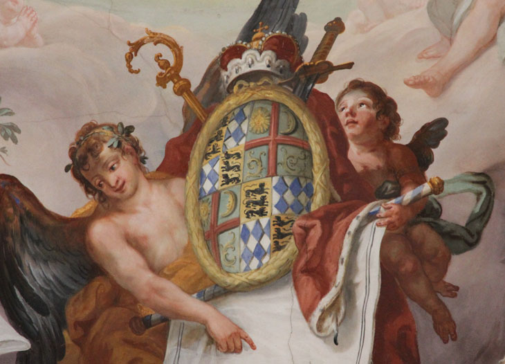 Klassizistisch ist vor allem auch die Rahmung der Deckenmalereien, als wären es Tafelbilder. Die Deckenmalereien bilden keinen Zusammenhang mit der Architektur, sondern sind gerade abgegrenzt, ganz im Gegensatz zum Barock, der die Übergänge zwischen Architektur, Skulptur und Malerei fließend, manchmal auch illusionistisch gestaltete. Hier haben wir keine innere Einheit der Gesamtausschmückung, sondern einzelne, in sich geschlossene Themendarstellungen, die auch klar nach außen abgegrenzt sind und der Architektur ihre eigene Show lassen.
