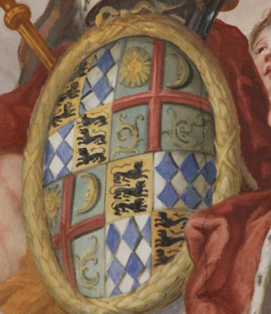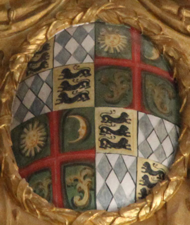 großes, leicht schräg in den Raum gestelltes Klosterwappen des Stifts