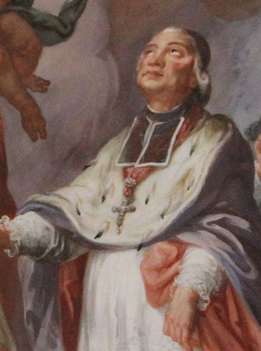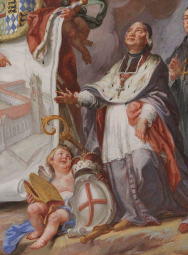 ein Engel neben ihm. Bischof Cyprianus kniet hinter ihm mit Mitra