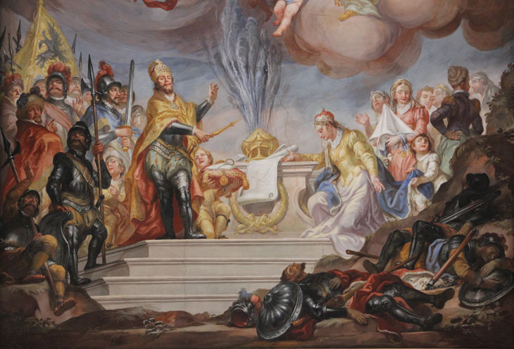 rechts beobachten die beiden Kirchenpatrone die Krönung: Papst