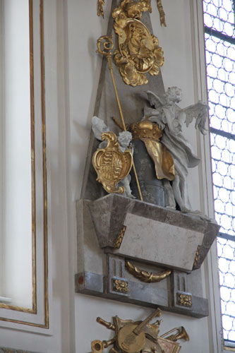 An den beiden Seiten des Chors befinden sich über dem Gestühl zwei obeliskenförmige Wanddenkmäler aus Stuck, ohne jede erklärende Inschrift. Auf der Südseite sehen wir eine Trauerfigur mit Stiftsfahne und Trophäen, darüber ein Medaillon mit einem Ritterbrustbild, auf der Nordseite sehen wir eine über eine Krone gebeugte Trauerfigur mit dem apokryphen Wappen der Adelindis. Beide Denkmäler weisen auf die Personen der Gründungslegende hin, auf die Trauer von Atto und Adelindis Nr. 3.