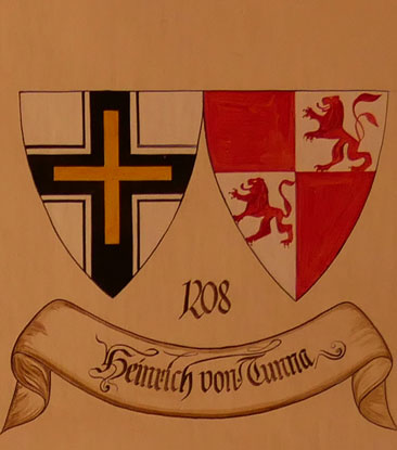 Abb. oben links: 1208-1209 Heinrich von Tunna gen. Bart (-2.6.1209, 1208 Pilgerreise ins Heilige Land, Ordenseintritt dort, 1208 Hochmeister, begraben in Akkon, kaum verläßliche Daten zu seinem Lebenslauf). Wappen aus zwei separaten Schilden, rechts ein schwarzes durchgehendes Kreuz, belegt mit einem goldenen griechischen Kreuz (frühes Hochmeisterkreuz), links hier rot-silbern geviert mit je einem doppelschwänzigen roten Löwen in den beiden silbernen Plätzen (Tunna gen. Bart). In der von Hans-Georg Boehm publizierten historischen Handschrift wird das Wappen in gevierter Form wiedergegeben, was zu dieser frühen Zeit äußerst unwahrscheinlich ist, Feld 1 und 4: Hochmeisterkreuz, Feld 2 und 3: Tunna, aber mit schwarzen Löwen in den silbernen Plätzen. Im Berliner Wappenbuch silbern-rot geviert, nur im ersten Viertel ein um 90 Grad gedrehter schwarzer Löwe.