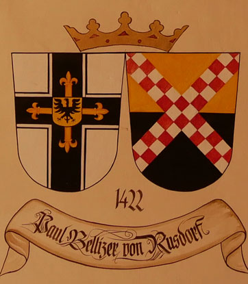 Abb. oben links: 1422-1441 Paul Belenzer (Bellizer) von Rusdorf (ca. 1385-9.1.1441, seit 1410 Ordensmitglied, 1415 oberster Trappier sowie Komtur von Mewe, 1416-1419 Oberster Treßler, 1418-22 Trappier und Komtur von Christburg, 1419-1422 Großkomtur in Marienburg, am 10.3.1422 Wahl zum Hochmeister nach Resignation seines Vorgängers, schloß am 27.9.1422 den Frieden von Melnosee mit Polen und Litauen, erneut Krieg mit Polen und Litauen, schloß am 31.12.1435 den "Ewigen Frieden" von Brest mit Polen, Ungarn und Litauen, resignierte von den inneren und äußeren Krisen des Ordens völlig zermürbt am 2.1.1441, eine Woche später gestorben in Marienburg, begraben in der St. Anna-Kirche). Wappen aus zwei separaten Schilden, rechts das Hochmeisterkreuz, links golden-schwarz geteilt mit einem in zwei Reihen silbern-rot geschachten Schragen (von Rusdorf). In der von Hans-Georg Boehm publizierten historischen Handschrift wird das Wappen alternativ in gevierter Form wiedergegeben, Feld 1 und 4: Hochmeisterkreuz, Feld 2 und 3: von Rusdorf, aber dort golden-blau geteilt mit einem roten Schragen ohne Feinstruktur. Im Berliner Wappenbuch Einzelschild, golden-blau geteilt mit einem in zwei Reihen silbern-rot geschachten Schragen.