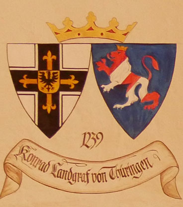 Abb. oben links: 1239-1240 Konrad von Thüringen, Konrad Raspe (ca. 1206-24.7.1240, am 18.11.1234 Ordenseintritt, 1239 Hochmeister, beteiligt an der Übertragung des Marburger Spitals und der Elisabethkirche in Marburg an den Orden, Gründer der Kommende Marburg, gestorben in Rom, beigesetzt in der Marburger Elisabethkirche). Wappen aus zwei separaten Schilden, rechts das Hochmeisterkreuz, links hier in Blau ein viermal schräglinks rot-silbern geteilter, golden gekrönter Löwe (falsch für die Landgrafschaft Thüringen, denn die Teilungen müssen horizontal verlaufen, und es sind mehr als vier). Dieses Wappen ist in der von Hans-Georg Boehm publizierten historischen Handschrift auf S. 23 völlig falsch und mit dem Wappen des Hochmeisters Reuß von Plauen oder Vogt von Plauen verwechselt worden. Das Wappen der Landgrafen von Thüringen findet sich dagegen auf S. 31 falsch unter Poppo von Osterna. Korrekt hingegen im Berliner Wappenbuch, in Blau ein golden gekrönter, siebenmal rot-silbern geteilter Löwe.
