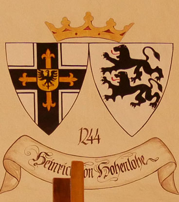 Abb. oben links: 1244-1249 Heinrich von Hohenlohe (ca. 1200-15.7.1249, 1218 Domherr in Würzburg, um 1219 Ordenseintritt zusammen mit zwei Brüdern, brachten Mergentheim als Schenkung an den Orden, Deutschmeister 1232-1242, Hochmeister 1244, Umgestaltung der Ordensregeln). Wappen aus zwei separaten Schilden, rechts das Hochmeisterkreuz, links in Silber zwei schwarze, schreitende Löwen übereinander (von Hohenlohe). In der von Hans-Georg Boehm publizierten historischen Handschrift wird das Wappen in gevierter Form wiedergegeben, was zu dieser frühen Zeit äußerst unwahrscheinlich ist, Feld 1 und 4: Hochmeisterkreuz, Feld 2 und 3: von Hohenlohe. In korrekter Darstellung wären die Löwen hersehend und mit untergeschlagenen Schwänzen abgebildet worden, was die hiesige Darstellung und diejenige bei Boehm beide vermissen lassen.