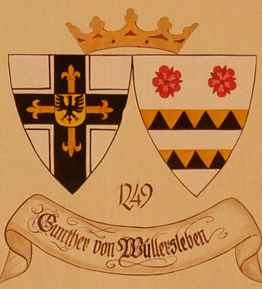Abb. oben rechts: 1249/1250-1252 Gunther von Wüllersleben (-1252, vermutlich hessische Familie, bereits 1215 Ordensritter in Akkon, vermutlich Ordensmarschall in Palästina, vermutlich Landkomtur in Apulien, 1246 in Preußen, Hochmeister 1249/1250, vieles in seiner Biographie unsicher und ungeklärt). Wappen aus zwei separaten Schilden, rechts das Hochmeisterkreuz, links in Silber zwei rote Rosen über zwei goldenen Balken, der obere mit 4, der untere mit 3 schwarzen Spitzen (von Wüllersleben). Dieses Wappen ist in der von Hans-Georg Boehm publizierten historischen Handschrift auf S. 29 falsch und mit dem Wappen des Hochmeisters von Osterna verwechselt worden. Ein Wüllersleben-Wappen fehlt. Im Berliner Wappenbuch fehlt es ebenfalls. Die hier gezeigte Variante ist bislang ohne Literaturbeleg. Das korrekte Wappen der von Wüllersleben ist mir nicht bekannt, Hinweise willkommen.