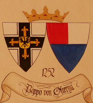 Abb. oben rechts: ca. 1200-1208 Otto von Kerpen (-1209, die Familie stammt von der Burg Kerpen in der Eifel, er gehörte zu den Gründungsrittern des Deutschen Ordens, spätestens seit 1197 mit einem Kreuzzug nach Outremer gekommen, in Akkon begraben). Wappen aus zwei separaten Schilden, rechts ein schwarzes durchgehendes Kreuz (Deutschordenskreuz), links in Silber ein blauer Zickzackbalken, oben angeschoben ein roter, dreilätziger Turnierkragen (von Kerpen). In der von Hans-Georg Boehm publizierten historischen Handschrift wird das Wappen in gevierter Form wiedergegeben, was zu dieser frühen Zeit äußerst unwahrscheinlich ist, Feld 1 und 4: Hochmeisterkreuz, Feld 2 und 3: Kerpen, aber mit rotem Zickzackbalken und blauem Turnierkragen. Im Berliner Wappenbuch roter Zickzackbalken und vierlätziger blauer Turnierkragen mit vier Lätzen. Die rote Tinktur des Zickzackbalkens ist durch Gruber, Zobel und Wolfert sicher belegt; der Turnierkragen dient der Differenzierung. Deshalb sind die Farben der Lengmooser Darstellung als falsch anzusehen, ebenso die genaue Form - der Turnierkragen ist nicht angeschoben, und üblich ist ein Zickzackbalken mit drei nach oben gezogenen Spitzen.