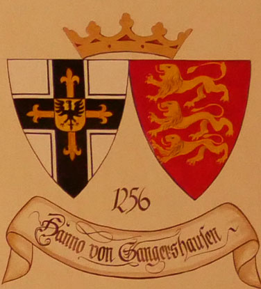 Abb. oben rechts: 1256-1273 Anno (Hanno) von Sangershausen (-8.7.1273, aus einer thüringischen Familie, 1253 Landmeister von Livland, Hochmeister 1256, Besiedlungspolitik, Preußenaufstand, Ort seines Todes und Begräbnisses unbekannt). Wappen aus zwei separaten Schilden, rechts das Hochmeisterkreuz, links in Rot drei schreitende goldene Löwen übereinander (von Sangershausen). In der von Hans-Georg Boehm publizierten historischen Handschrift wird das Wappen in gevierter Form wiedergegeben, was zu dieser frühen Zeit äußerst unwahrscheinlich ist, Feld 1 und 4: Hochmeisterkreuz, Feld 2 und 3: von Sangershausen. Im Berliner Wappenbuch Einzelschild, aber andere Tinkturen, in Silber drei schwarze, golden gezungte und ebenso bewehrte, hersehende, schreitende Löwen übereinander. Für das Wappen der thüringischen von Sangershausen bzw. Grafen von Sangershausen werden in Rot drei (2:1) goldene Löwen angegeben.
