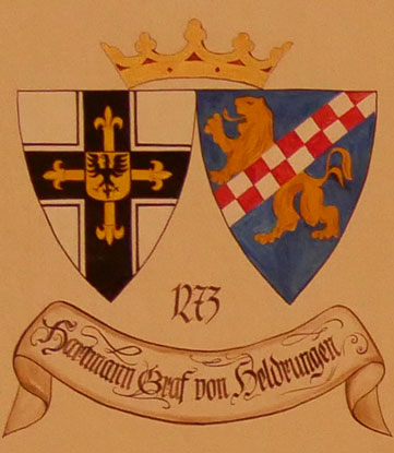 Abb. oben links: 1273-1282 Hartmann von Heldrungen (ca. 1210-19.8.1282, seit dem 18.11.1234 Ordensmitglied, 1238 Landkomtur der Ballei Sachsen, 1261-1266 Großkomtur, 1273 Hochmeister, Vollendung der Unterwerfung Preußens, gestorben in Akkon). Wappen aus zwei separaten Schilden, rechts das Hochmeisterkreuz, links in Blau ein goldener Löwe, überdeckt von einem in zwei Reihen rot-silbern geschachten Schräglinksbalken (von Heldrungen). In der von Hans-Georg Boehm publizierten historischen Handschrift wird das Wappen in gevierter Form wiedergegeben, was zu dieser frühen Zeit äußerst unwahrscheinlich ist, Feld 1 und 4: Hochmeisterkreuz, Feld 2 und 3: von Heldrungen, aber falsch mit schwarzem Feld. Im Berliner Wappenbuch Einzelschild und ganz andere Tinkturen, in Gold ein schwarzer, rotgezungter Löwe, überdeckt von einer rot-silbern in zwei Reihen geschachten Schrägleiste. Das Wappen der Herrschaft Heldrungen ist mit blauer Feldfarbe und goldenem Löwen belegt im Siebmacher Band: SchwA Seite: 13 Tafel: 8 und wird genau so auch immer noch als Kommunalwappen geführt.