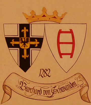 Abb. oben rechts: 1283-1290 Burchard von Schwanden (-27.7.1310, aus einer in Schwanden im schweizerischen Kanton Bern ansässigen Familie, Komtur von Köniz 1275, Landkomtur für die Balleien Thüringen und Sachsen 1277, Hochmeister 1283, gewählt in Akkon, 1290 Militärexpedition ins bedrohte Akkon, trat nach seiner Ankunft zurück, Akkon ging ein Jahr später verloren, Burchard von Schwanden wechselte danach zu den Johannitern und war in mehreren Johanniterkommenden Komtur, gestorben auf Rhodos, vieles im Unklaren). Wappen aus zwei separaten Schilden, rechts das Hochmeisterkreuz, links in Silber eine rote Leiter oder Faßleiter mit nach außen gebogenen Holmen und drei Sprossen (von Schwanden). In der von Hans-Georg Boehm publizierten historischen Handschrift wird das Wappen in gevierter Form wiedergegeben, was zu dieser frühen Zeit äußerst unwahrscheinlich ist, Feld 1 und 4: Hochmeisterkreuz, Feld 2 und 3: von Schwanden, aber mit geraden, durchgehenden Holmen. Im Berliner Wappenbuch Einzelschild, in goldenem, mit blauen, schrägrechtsgelegten Schindeln bestreutem Feld schrägrechts eine rote Faßleiter mit zwei Sprossen.