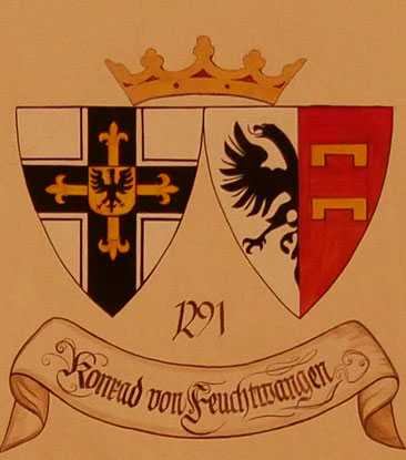 Abb. oben links: 1291-1296 Konrad von Feuchtwangen (-4.7.1296, um 1259 und 1271-1279 Landkomtur der Ballei Österreich, 1279-1280 Landmeister in Preußen, 1279-1281 Landmeister in Livland, 1282 Landkomtur der Ballei Franken, 1284-1290 Deutschmeister, 1291 Hochmeister, verlegte den Deutschordenssitz nach dem Verlust der letzten Bastionen (Akkon) im Heiligen Land 1291 nach Venedig, errichtete die Marienburg, 1287 Komtur von Mergentheim, gestorben in Prag, begraben in der Deutschordenskirche von Dobrovítov (Dobrowitow) in Böhmen). Wappen aus zwei separaten Schilden, rechts das Hochmeisterkreuz, links gespalten, rechts in Silber ein halber schwarzer Adler am Spalt, links in Rot zwei goldene, zweimal unten gezinnte Balken (von Feuchtwangen), hier vereinfacht. In der von Hans-Georg Boehm publizierten historischen Handschrift wird das Wappen in gevierter Form wiedergegeben, was zu dieser frühen Zeit äußerst unwahrscheinlich ist, Feld 1 und 4: Hochmeisterkreuz, Feld 2 und 3: von Feuchtwangen. Im Berliner Wappenbuch Einzelschild, gespalten, rechts fünfmal silbern-rot abwechselnd im Zinnenschnitt und einfach geteilt, mit 3:2:1 Zinnen, links in Gold ein halber, schwarzer, rotbewehrter und -gezungter Adler am Spalt. Vgl. Siebmacher Band: BayA2 Seite: 36 Tafel: 23.