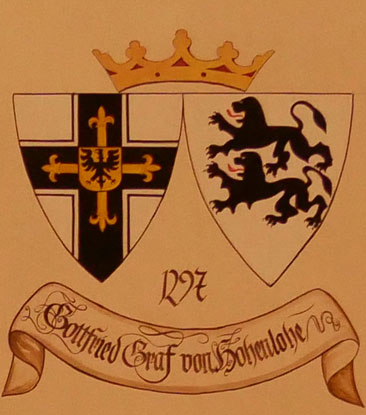 Abb. oben rechts: 1297-1303 Gottfried von Hohenlohe (1265-5.11.1309, Landkomtur von Franken 1290, Wahl zum Hochmeister am 3.5.1297 in Venedig, Verlust der Ordensbesitzungen bei Neapel und Venedig 1303, 1302 vorläufige Resignation in Memel, wurde zum Rücktritt genötigt, am 18.10.1303 endgültige Resignation, danach in der Ballei Franken erneut als Landkomtur, Widerruf seines Rücktritts, gestorben in Mergentheim, begraben in Marburg). Wappen aus zwei separaten Schilden, rechts das Hochmeisterkreuz, links in Silber zwei schwarze, schreitende Löwen übereinander (von Hohenlohe). In der von Hans-Georg Boehm publizierten historischen Handschrift wird das Wappen in gevierter Form wiedergegeben, was zu dieser frühen Zeit äußerst unwahrscheinlich ist, Feld 1 und 4: Hochmeisterkreuz, Feld 2 und 3: von Hohenlohe. Im Berliner Wappenbuch Einzelschild, dort werden die Hohenloher Leoparden korrekt dargestellt, nämlich hersehend und mit untergeschlagenen Schwänzen, was die hiesige Darstellung und diejenige bei Boehm vermissen lassen.