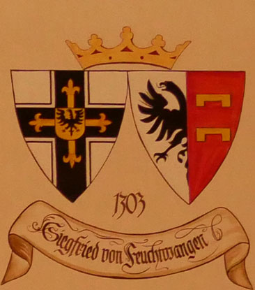 Abb. oben links: 1303-1311 Siegfried von Feuchtwangen (-3.5.1311, bereits 1298 als Deutschmeister nachweisbar, 1299-1300 Komtur von Wien, Wahl zum Hochmeister am 18.10.1303, Übernahme von Danzig 1308, Verlegung des Hauptsitzes auf die Marienburg 1309 unter dem Einfluß a) der Auflösung des Templerordens 1307, b) des Interdikts über Venedig 1302 und c) der Verlegung des Papsttums nach Avignon 1309, der Verlegung folgend Exkommunizierung des Hochmeisters durch den päpstlichen Legaten Francesco di Moliano, gestorben auf der Marienburg, begraben im Dom zu Kulmsee). Wappen aus zwei separaten Schilden, rechts das Hochmeisterkreuz, links gespalten, rechts in Silber ein halber schwarzer Adler am Spalt, links in Rot zwei goldene, zweimal unten gezinnte Balken (von Feuchtwangen), hier vereinfacht. In der von Hans-Georg Boehm publizierten historischen Handschrift wird das Wappen in gevierter Form wiedergegeben, was zu dieser frühen Zeit äußerst unwahrscheinlich ist, Feld 1 und 4: Hochmeisterkreuz, Feld 2 und 3: von Feuchtwangen. Im Berliner Wappenbuch Einzelschild, gespalten, rechts fünfmal silbern-rot abwechselnd im Zinnenschnitt und einfach geteilt, mit 3:2:1 Zinnen, links in Gold ein halber, schwarzer, rotbewehrter und -gezungter Adler am Spalt.