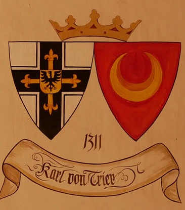 Abb. oben rechts: 1311-1324 Karl von Trier (ca. 1265-11.2.1324, Komtur in Beauvoir in der Champagne, Landkomtur der Balleien Lothringen und Frankreich, 1304 Großkomtur, Stellvertreter des Hochmeisters in Venedig, Hochmeister 1311). Wappen aus zwei separaten Schilden, rechts das Hochmeisterkreuz, links in Rot eine liegende goldene Mondsichel (von Trier). In der von Hans-Georg Boehm publizierten historischen Handschrift wird das Wappen in gevierter Form wiedergegeben, was zu dieser frühen Zeit unwahrscheinlich ist, Feld 1 und 4: Hochmeisterkreuz, Feld 2 und 3: von Trier, aber falsch in Blau eine liegende goldene Mondsichel. Die Familie führt laut Gruber in Gold eine rote liegende Mondsichel. Im Berliner Wappenbuch ebenfalls in Gold eine rote liegende Mondsichel, als Einzelschild.