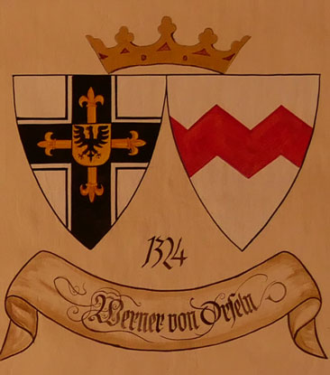 Abb. oben links: 1324-1330 Werner von Orseln (ca. 1280-18.11.1330, 1312-1313 Komtur von Ragnit = Neman bei Kaliningrad, 1314-1324 Großkomtur, Wahl zum Hochmeister am 6.7.1324, Ausbau der Wehranlagen der Marienburg). Wappen aus zwei separaten Schilden, rechts das Hochmeisterkreuz, links in Silber ein roter Zickzackbalken (von Orseln), hier unglücklich zugeschnitten. In der von Hans-Georg Boehm publizierten historischen Handschrift wird das Wappen in gevierter Form wiedergegeben, was zu dieser frühen Zeit unwahrscheinlich ist, Feld 1 und 4: Hochmeisterkreuz, Feld 2 und 3: von Orseln, aber ein klarer Doppelsparren. Im Berliner Wappenbuch Einzelschild, aber mit anderer Feldfarbe, in Gold ein roter Doppelsparren.