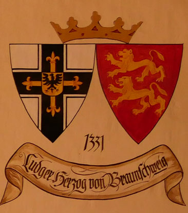 Abb. oben rechts: 1331-1335 Luther (Luder, Ludger) von Braunschweig (ca. 1275-18.4.1335, seit spätestens 1297 in Preußen, 1308-1312 Komtur von Gollub = Golub-Dobrzyn in der Woiwodschaft Kujawien-Pommern, 1313 Hauskomtur der Marienburg, 1314-1331 oberster Trappier und Komtur von Christburg = Dzierzgon in der Woiwodschaft Pommern, Großgebietiger, am 17.2.1331 Wahl zum Hochmeister, Förderung der Kolonisation und der Ordens-Bautätigkeit, bestattet im Königsberger Dom). Wappen aus zwei separaten Schilden, rechts das Hochmeisterkreuz, links in Rot zwei goldene schreitende Löwen übereinander (Herzogtum Braunschweig). In der von Hans-Georg Boehm publizierten historischen Handschrift wird das Wappen in gevierter Form wiedergegeben, was zu dieser frühen Zeit unwahrscheinlich ist, Feld 1 und 4: Hochmeisterkreuz, Feld 2 und 3: Braunschweig. Im Berliner Wappenbuch Einzelschild, Löwen aber hersehend.