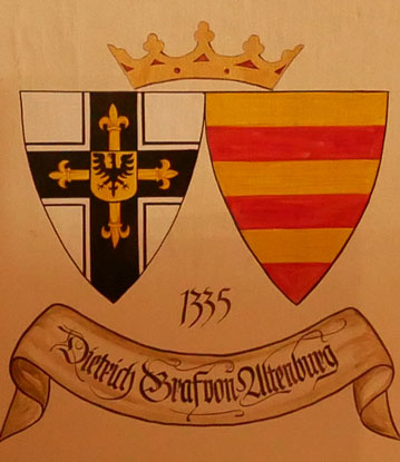 Abb. oben links: 1335-1341 Dietrich von Altenburg (-1341, aus der Familie der Burggrafen von Altenburg, ultimus familiae, Ordenseintritt spätestens 1307, 1320-1324 Komtur von Ragnit = Neman bei Königsberg = Kaliningrad, 1328-1331 Komtur in Balga ebenfalls bei Königsberg = Kaliningrad, 1331 Ordensmarschall, 1335 Hochmeister, Kämpfe gegen Litauen, baute das Ordensland mit Burgen aus, baute in der Marienburg Marienkirche und St Anna-Kapelle und die erste feste Nogatbrücke mit Türmen und Brückentor, gestorben in Thorn, begraben in der St. Anna-Kapelle). Wappen aus zwei separaten Schilden, rechts das Hochmeisterkreuz, links hier golden-rot fünfmal geteilt (angeblich für Altenburg, unplausibel). Fehlt in der von Hans-Georg Boehm publizierten historischen Handschrift. Im Berliner Wappenbuch Einzelschild, in Silber eine rote, golden bebutzte Rose (Burggrafen von Altenburg), was plausibler ist.