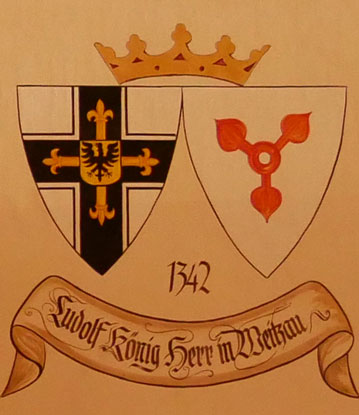 Abb. oben rechts: 1342-1345 Ludolf König von Wattzau/Weitzau (-1348, aus einer sächsischen Familie, 1331-1338 oberster Treßler, 1338 Großkomtur = Stellvertreter des Hochmeisters, Wahl am 6.1.1342 zum Hochmeister, schloß am 8.7.1343 den Vertrags von Kalisch mit Polen, der dem Deutschen Orden den Besitz Pommerellens, des Kulmerlandes und der Michelau sicherte, Krieg gegen Litauen, 1345 Resignation aus Gesundheitsgründen, danach Komtur von Engelsburg). Wappen aus zwei separaten Schilden, rechts das Hochmeisterkreuz, links in Silber drei rote, in den Dreipaß gestellte Seeblätter, die Stiele zu einem Ring verbunden (König von Wattzau). In der von Hans-Georg Boehm publizierten historischen Handschrift wird das Wappen in gevierter Form wiedergegeben, was zu dieser frühen Zeit unwahrscheinlich ist, Feld 1 und 4: Hochmeisterkreuz, Feld 2 und 3: König von Wattzau. Im Berliner Wappenbuch Einzelschild, abweichende Feldfarbe und Darstellung, in Gold drei rote, in den Dreipaß gestellte Seeblätter. ohne den Ring in der Mitte.