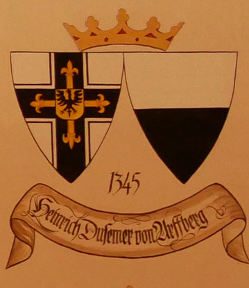 Abb. oben links: 1345-1351 Heinrich Dusemer von Arf(f)berg (-1353, erscheint 1311 erstmals als Ordensritter, Komtur von Ragnit = Neman bei Kaliningrad, Komtur von Brandenburg = Kaliningrad, 1335-1339 Ordensmarschall, 1345 Statthalter, am 13.12.1345 Wahl zum Hochmeister, trieb die Kolonisierung und Städtegründung erheblich voran, Baus des Hochmeisterpalastes auf der Marienburg, 1351 Abdankung aus Gesundheitsgründen, danach lebte er in Brattian = Bratian, dort auch gestorben). Wappen aus zwei separaten Schilden, rechts das Hochmeisterkreuz, links hier silbern-schwarz geteilt (Dusemer von Arf(f)berg). In der von Hans-Georg Boehm publizierten historischen Handschrift wird das Wappen in gevierter Form wiedergegeben, was zu dieser frühen Zeit unwahrscheinlich ist, Feld 1 und 4: Hochmeisterkreuz, Feld 2 und 3: golden-schwarz geteilt (Dusemer von Arf(f)berg). Im Berliner Wappenbuch Einzelschild, ebenfalls golden-schwarz geteilt.