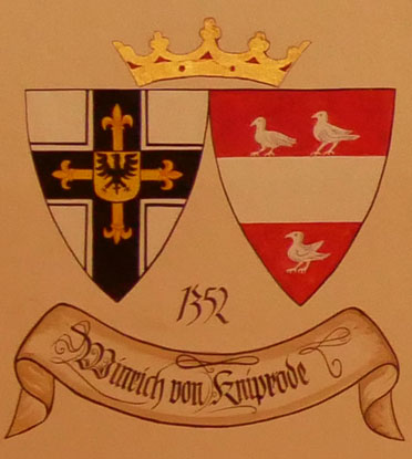 Abb. oben rechts: 1351-1382 Winrich von Kniprode (Knipenrode, ca. 1310-24.6.1832, aus einer rheinischen Familie mit Sitz in Knipprath bei Monheim, 1338-1341 Komtur von Danzig, 1342 Komtur von Balga, 1343-1346 Ordensmarschall und Komtur von Königsberg, 1346 Großkomtur = Stellvertreter des Hochmeisters, 1348 Sieg über die Litauer, am 14.9.1351 Wahl zum Hochmeister, Krieg gegen Litauen, gestorben bei Marienburg, beigesetzt in der St. Anna-Kirche). Wappen aus zwei separaten Schilden, rechts das Hochmeisterkreuz, links in Rot ein silberner, von drei (2:1) schreitenden silbernen Vögeln begleiteter Balken (von Kniprode). In der von Hans-Georg Boehm publizierten historischen Handschrift wird das Wappen in gevierter Form wiedergegeben, was zu dieser frühen Zeit unwahrscheinlich ist, Feld 1 und 4: Hochmeisterkreuz, Feld 2 und 3: von Kniprode. Im Berliner Wappenbuch in Silber ein roter Balken zwischen drei (2:1) schwarzen Vögeln.