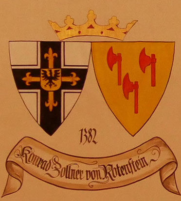 Abb. oben links: 1382-1390 Konrad Zollner (Zöllner) von Rottenstein (-20.8.1390, fränkische Familie mit Sitz Rottenstein in den Haßbergen, 1368 Komtur von Danzig, 1372 oberster Trappier und Komtur von Christburg, am 5.10.1382 Wahl zum Hochmeister, gestorben in Christburg = Dzierzgon in der polnischen Woiwodschaft Pommern, begraben in der St. Anna-Kirche in der Marienburg). Wappen aus zwei separaten Schilden, rechts das Hochmeisterkreuz, links hier in Gold drei (2:1) rote, mit der Schneide nach rechts gestellte Beile (Zollner von Rottenstein). In der von Hans-Georg Boehm publizierten historischen Handschrift wird das Wappen in gevierter Form wiedergegeben, was zu dieser frühen Zeit unwahrscheinlich ist, Feld 1 und 4: Hochmeisterkreuz, Feld 2 und 3: Zollner (Zöllner) von Rottenstein, mit goldener Feldfarbe. Im Berliner Wappenbuch Einzelschild, mit silberner Feldfarbe, ebenso in weiteren historischen Wappenbüchern. Das Familienwappen wird auch im Siebmacher Band: OstN Seite: 264 Tafel: 186 mit silberner Feldfarbe beschrieben.
