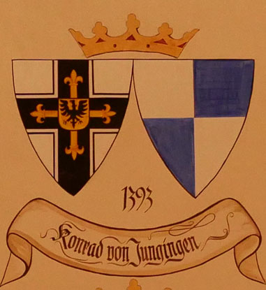 Abb. oben links: 1393-1407 Konrad von Jungingen (-30.3.1407, aus einer schwäbischen Familie aus dem Raum Konstanz, älterer Bruder seines Amtsnachfolgers, Hauskomtur von Osterode = Ostróda in der Woiwodschaft Ermland-Masuren 1387, Oberster Treßler 1390-1393, 1393 Hochmeister, befreite die Ostsee von Piraten, Likedeelern und Störtebecker, höchste Blüte des Ordens in Hinblick auf territoriale Ausdehnung, wirtschaftliche Prosperität und Kultur und Bildung, gestorben in der Marienburg). Wappen aus zwei separaten Schilden, rechts das Hochmeisterkreuz, links von Silber und Blau geviert (von Jungingen). In der von Hans-Georg Boehm publizierten historischen Handschrift wird das Wappen alternativ in gevierter Form wiedergegeben, Feld 1 und 4: Hochmeisterkreuz, Feld 2 und 3: von Jungingen. Im Berliner Wappenbuch Einzelschild.