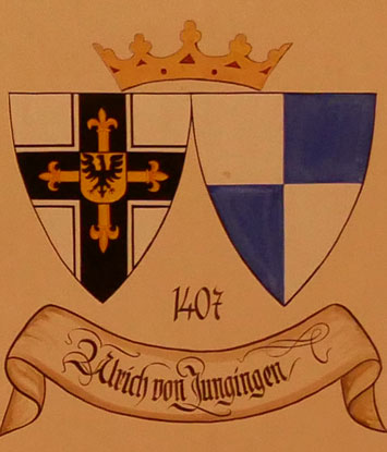 Abb. oben rechts: 1407-1410 Ulrich von Jungingen (-15.7.1410, aus einer schwäbischen Familie aus dem Raum Konstanz, jüngerer Bruder seines Amtsvorgängers, Komtur von Balga 1396, 1404 Ordensmarschall und Komtur von Königsberg, am 26.6.1407 Wahl zum Hochmeister, 1409 Kriegserklärung an Polen und Litauen, Verlierer der Schlacht von Tannenberg, in der er den Tod fand, begraben in der Gruft der St. Anna-Kirche der Marienburg). Wappen aus zwei separaten Schilden, rechts das Hochmeisterkreuz, links von Silber und Blau geviert (von Jungingen). In der von Hans-Georg Boehm publizierten historischen Handschrift wird das Wappen alternativ in gevierter Form wiedergegeben, Feld 1 und 4: Hochmeisterkreuz, Feld 2 und 3: von Jungingen. Im Berliner Wappenbuch Einzelschild.