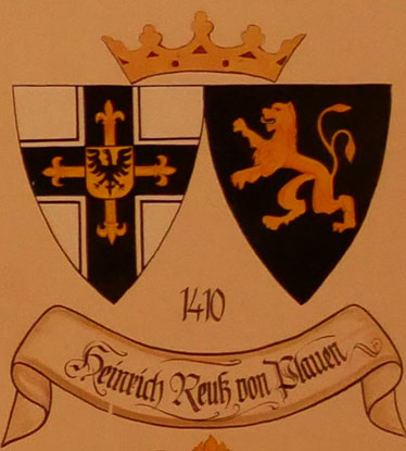 Abb. oben rechts: 1467-1470 Heinrich Reuß von Plauen (1400-2.1.1470, diesmal wirklich aus der Linie der Reuß von Plauen, Neffe von Ludwig von Ellrichshausen, Komtur von Balga 1433, danach von Elbing, 1440 wieder von Balga, oberster Spittler und Komtur von Elbing 1441, führte ein Ordensheer im Dreizehnjährigen Krieg gegen Polen, Reise nach Jerusalem, seit 1461 Ritter vom Heiligen Grab, Komtur von Preußisch Holland = Paslek in Polen 1466, 1467 Statthalter des Hochmeistertums, 15.10.1469 Wahl zum Hochmeister, am 29.11.1469 Huldigungseid zu Peterkau, gestorben in Mohrungen, beigesetzt im Königsberger Dom). Wappen aus zwei separaten Schilden, rechts das Hochmeisterkreuz, links in Schwarz ein goldener Löwe (Reuß von Plauen). In der von Hans-Georg Boehm publizierten historischen Handschrift wird das Wappen alternativ in gevierter Form wiedergegeben, Feld 1 und 4: Hochmeisterkreuz, Feld 2 und 3: Reuß von Plauen.
