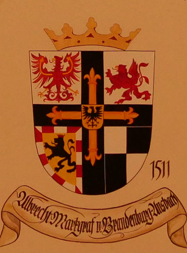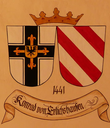 Abb. oben rechts: 1441-1449 Konrad von Ellrichshausen (-7.11.1449, Komtur von Ragnit = Neman in Ostpreußen, Komtur von Thorn = Torun in der Woiwodschaft Kujawien-Pommern, Komtur von Althaus, 1432-1439 Großkomtur, 1440-1441 Ordensmarschall, am 2.1.1441 Wahl zum Hochmeister nach dem Rücktritt seines Vorgängers, Politik des Ausgleichs, 1442 Reform der Ordensregeln, 1448 Frieden von Rastenburg mit Polen, gestorben in der Marienburg, beerdigt in St. Anna-Kirche in der Marienburg). Wappen aus zwei separaten Schilden, rechts das Hochmeisterkreuz, links silbern-rot fünfmal schräggeteilt (von Ellrichshausen). Im Berliner Wappenbuch Einzelschild. In der von Hans-Georg Boehm publizierten historischen Handschrift wird das Wappen alternativ in gevierter Form wiedergegeben, Feld 1 und 4: Hochmeisterkreuz, Feld 2 und 3: von Ellrichshausen.