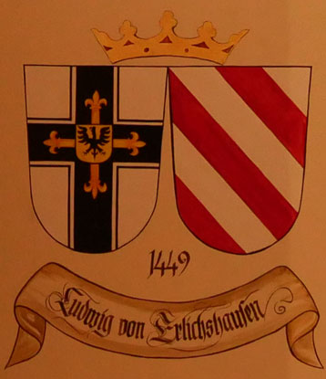 Abb. oben links: 1450-1467 Ludwig von Ellrichshausen (-4.4.1467, seit 1434 Ordensmitglied, 1442-1447 Komtur von Schönsee = Kowalewo Pomorskie in der Woiwodschaft Kujawien-Pommern, 1446-1450 Komtur von Mewe = Gniew in der Woiwodschaft Pommern, Wahl zum Hochmeister am 21.3.1450, führte das Land in den Dreizehnjährigen Krieg, gestorben in Altstadt (Königsberg = Kaliningrad), beigesetzt im Königsberger Dom). Wappen aus zwei separaten Schilden, rechts das Hochmeisterkreuz, links silbern-rot fünfmal schräggeteilt (von Ellrichshausen). In der von Hans-Georg Boehm publizierten historischen Handschrift wird das Wappen alternativ in gevierter Form wiedergegeben, Feld 1 und 4: Hochmeisterkreuz, Feld 2 und 3: von Ellrichshausen.