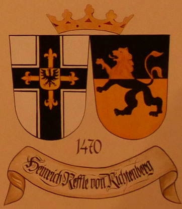 Abb. oben links: 1470-1477 Heinrich Reffle von Richtenberg (ca. 1415-1477, aus einer schwäbischen Familie, Großgebietiger, am 29.10.1470 Wahl zum Hochmeister, gestorben in Königsberg, beigesetzt im Königsberger Dom). Wappen aus zwei separaten Schilden, rechts das Hochmeisterkreuz, links schwarz-golden geteilt mit einem Löwen in verwechselten Farben (Reffle von Richtenberg). In der von Hans-Georg Boehm publizierten historischen Handschrift wird das Wappen alternativ in gevierter Form wiedergegeben, Feld 1 und 4: Hochmeisterkreuz, Feld 2 und 3: Reffle von Richtenberg.