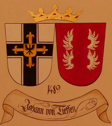 Abb. oben: 1490-1497 Johann von Tiefen (ca. 1440-25.8.1497, aus einer schweizerischen Familie stammend, 1474-1477 Komtur in Memel, dann Großkomtur, 1480 Oberster Spittler und Komtur von Brandenburg (Frisches Haff) = Kaliningrad = Uschakowo, 1489 Statthalter des Hochmeistertums, Wahl zum Hochmeister am 1.9.1490, Reformpolitik, auf Anregung des polnischen Königs Kreuzzug gegen das Osmanische Reich, erkrankte auf dem Feldzug an der Ruhr und starb in Lemberg, begraben im Königsberger Dom). Wappen aus zwei separaten Schilden, rechts das Hochmeisterkreuz, links in Rot zwei silberne Flügelpaare übereinander (von Tiefen). In der von Hans-Georg Boehm publizierten historischen Handschrift wird das Wappen alternativ in gevierter Form wiedergegeben, Feld 1 und 4: Hochmeisterkreuz, Feld 2 und 3: in Rot zwei silberne Flügelpaare übereinander (von Tiefen).