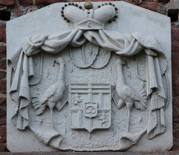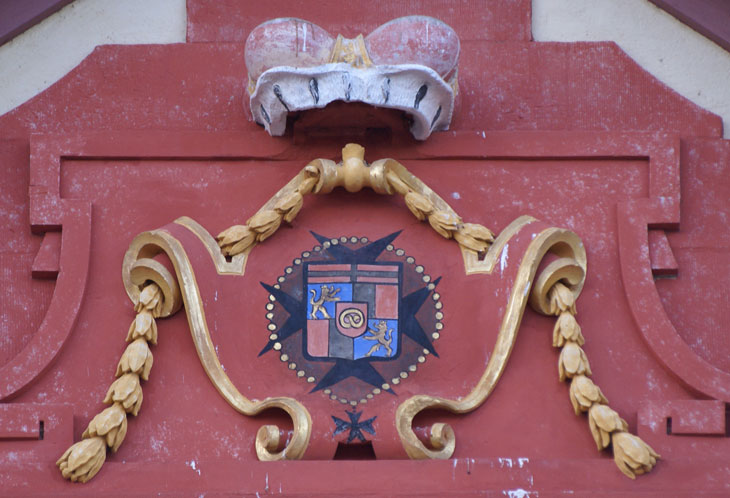 Fürst Karl August von Bretzenheim hatte zum fürstlichen Wappen (geviert, Feld 1 und 4: in Blau einwärts ein gekrönter, goldener Löwe, Feld 2: silbern-rot gespalten, Feld 3: rot-silbern gespalten, Herzschild: in Rot eine gestürzte goldene Brezel) noch eine Ergänzung, denn als Großprior des Malteserordens (die "bayerisch-englische Zunge" des Ordens wurde erst 1780 eigens für ihn gegründet) führte er ein rotes, mit einem durchgehenden silbernen Balkenkreuz belegtes Schildhaupt (Siebmacher Band: FstA Seite: 24 Tafel: 22). Der Malteserorden in Bayern wurde 1799 aufgelöst, im selben Jahr ohne Karl August neu gegründet und 1806 endgültig aufgelöst. Feld 3 kommt im Rahmen der künstlerischen Freiheit aus ästhetischen Gründen gewendet vor, vermutlich a) weil Feld 1 auch gewendet ist und so eine höhere Symmetrie erreicht wird und b) weil sich so der Herzschild kontrastreicher vom Hauptschild abhebt. In der Ruine des Schloßbaus kann man das Wappen des Fürsten von Bretzenheim sehen, mit Straußen mit Hufeisen im Schnabel als Schildhaltern und mit Wappenmantel. In farbigen Darstellungen sind die Straußen naturfarben, jeweils mit einem Hufeisen im Schnabel, im Siebmacher widersehend.
