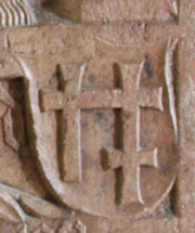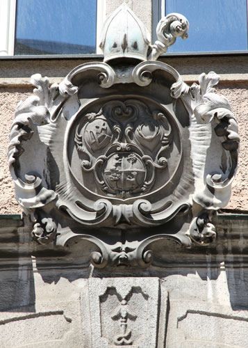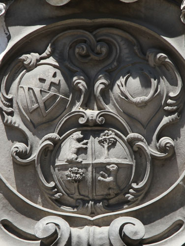 Die beiden Wappen unter der Inschrift sind die der Steinpöck (in Gold ein schwarzer Steinbock, auf dem gekrönten Helm mit schwarz-goldenen Decken ein schwarzer Steinbock wachsend, Siebmacher Band: NÖ2 Seite: 223 Tafel: 93) und der Gneuss (ein Balken, oben mit drei Zinnen und zwei Scharten, auf dem Helm ein Flug, jeder Flügel mit einem Schrägbalken, oben mit drei Zinnen und zwei Scharten, Tinkturen unbekannt, Siebmacher Band: OÖ Seite: 68-69 Tafel: 27). Der Stammsitz der Familie Steinpöck ist Steinbach bei Waldkirchen im Mühlviertel. Besagter Christoph Steinpöck saß auf Steinbach und Haitzing. Außerdem war der Ritter Pfandinhaber der Herrschaft Seissenburg. Seine Frau Apollonia war die Tochter von Veit Gneuss auf Steinabrunn und von Margareta Kirchberger a. d. H. Egenberg. Ihrer beider Sohn Christoph d. J. auf Wolfsbach erhielt am 20.5.1559 einen kaiserlichen Wappenbrief.