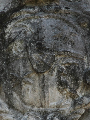 Die Wappendarstellung im Zentralfeld ist in Bezug auf Schild und Kleinod mit andersfarbigem Stein eingelegt, aber in Bezug auf Helm und Helmdecken nur eine Ritzzeichnung. Passend zur Entstehungszeit ist als Helmtyp der Kübelhelm gewählt worden. Das Kleinod, eigentlich ein halber Flug, hat die damals modische Form eines Kinnbackenknochens. Am 21.6.1982 hat die oberösterreichische Landesregierung beschlossen, der Gemeinde Aistersheim entsprechend des Vorschlages des Gemeinderates vom 18.3.1982 den Wappenschild der einstigen Ortsherren als Kommunalwappen zu verleihen (Publikation LGBl.Nr. 45/1982). Die ganze Platte ist hier verkehrt herum angebracht, so daß das Wappen gestürzt erscheint. Ein absichtliches Stürzen des Wappens können wir verneinen, weil die Familie im 14. Jh. noch nicht erlöschen ist. Die Familie der Aistersheimer taucht erstmals mit Dietmarus de Eistersheim, einem Ministerialen der Otakare in Steyr, als Zeuge in einer Passauer Urkunde vom 11.11.1146 auf. Die Familie erlosch im Mannesstamm erst mit Heinrich von Aistersheim 1426. Aistersheim kam an die Herren von Hohenfeld, als Johann von Hohenfeld Anna von Aistersheim heiratete, 1464 den Besitz kaufte und nun einen eigenen Zweig der Herren von Hohenfeld zu Aistersheim etablierte. Das heutige Wasserschloß Aistersheim, eine renovierungsbedürftige, an den Ecken von massiven Rundtürmen flankierte Vierkantanlage, stammt aus der zweiten Hälfte des 16. Jh. und wurde bereits unter den neuen Besitzern der Herrschaft errichtet: Der Bauherr der Renaissance-Anlage war hauptsächlich Achaz von Hohenfeld.