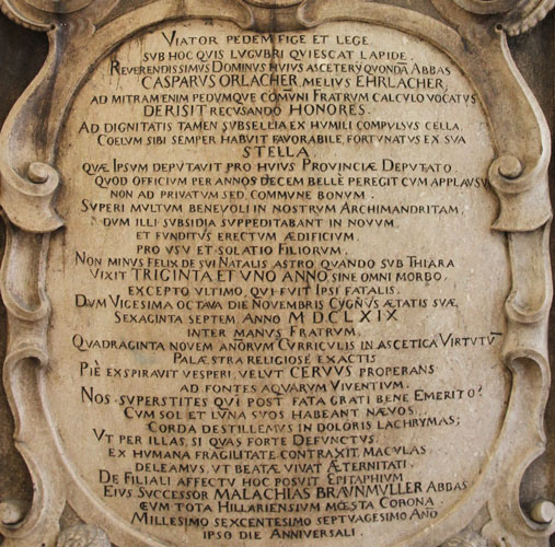 Das letzte hier vorgestellte Epitaph ist auf 1657 datiert und mit sehr viel Vergänglichkeitssymbolik verziert (Gerippe, Totenköpfe, Sanduhren, Sarg, Sense, Schaufel, Knochen, Fledermausflügel). Die nicht namentlich zugeordnete Platte trägt folgende Inschrift: "VIATOR PER COMPENDIVM LEGE LAVDES DEFVNCTI / FVIT HIC IVDEX ANNIS 40 HVIVS DOMVS ET EA / FIDELITATE, VT EVANGELICI SERVI LAVDEM MEREATVR / FVIT OLIM ACATHOLICVS SED FIDE AGNITA ITA IN / ILLAM EXARSIT, VT ALIVM IN ILLO VIDERES PAVLVM / FVIT SVMMVS CVLTOR DEI PARAE, CVI STATVAS ET / ARAS EREXIT SVIS SVMPTIBVS ET AMORE. / QVAERIS LECTOR VBI CVBET EMORTVI ANIMA? / IN SINV DILECTAE. / PVLLATA HOC EPITAPHIV(M) HILARIA POSVIT / ANNO M.D.C.LVII." Das Wappen ist geviert, Feld 1 und 4: eine Lilie, Feld 2 und 3: ein sechszackiger Stern, auf dem bewulsteten Helm ein Paar Büffelhörner. Es handelt sich um Martin Wulff (-13.2.1657), 40 Jahre lang Hofrichter in Wilhering und Ökonom des Stifts. Die Tinkturen sind unbekannt.